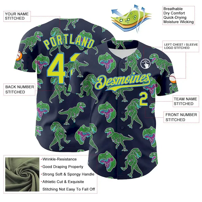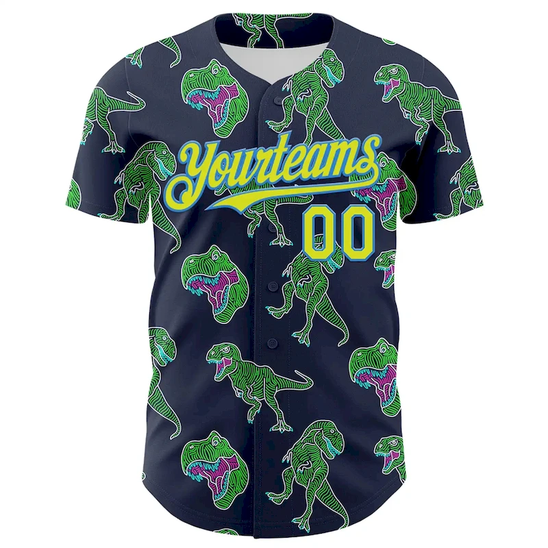 Custom Navy Neon Yellow-Electric Blue 3D Pattern Design Rave Psychedelic Neon Dinosaur Authentic Baseball Jersey