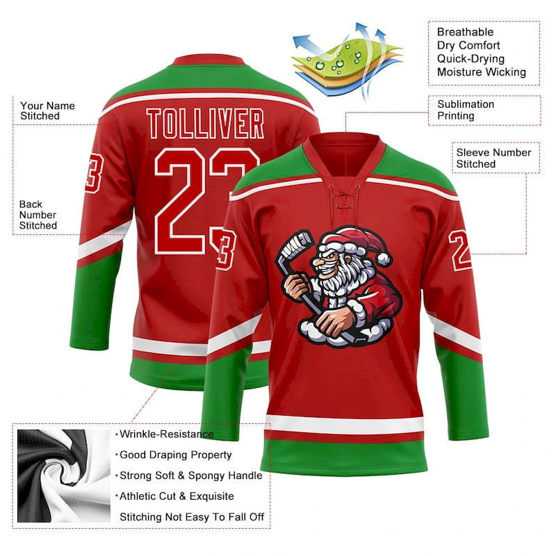 Custom Red Grass Green-White Christmas Santa Claus 3D Hockey Lace Neck Jersey